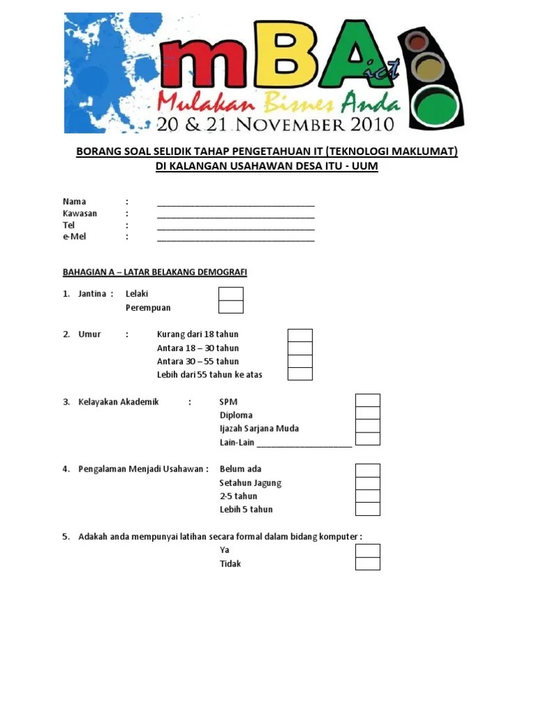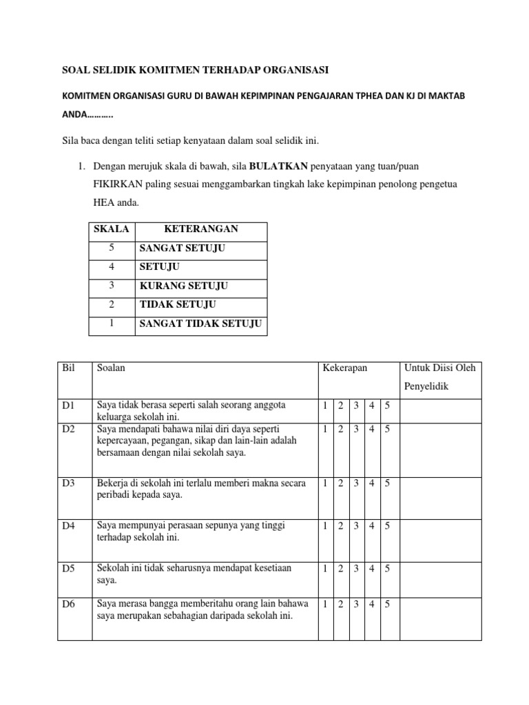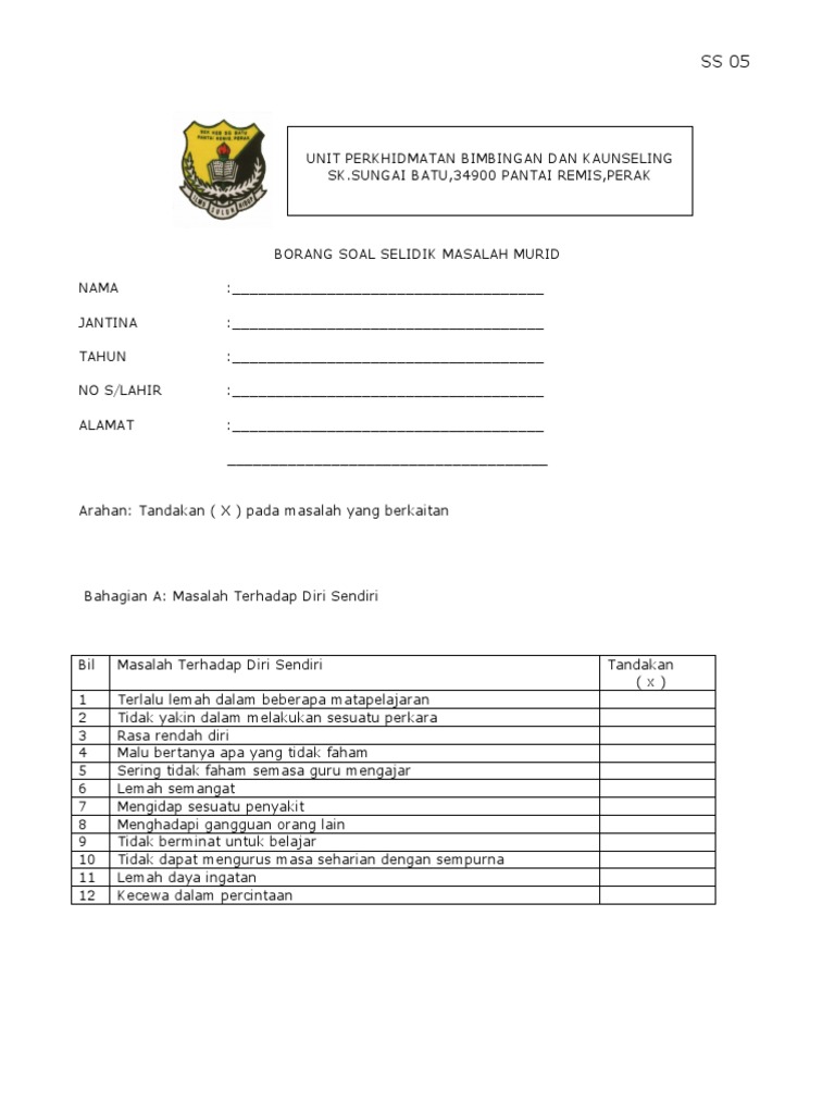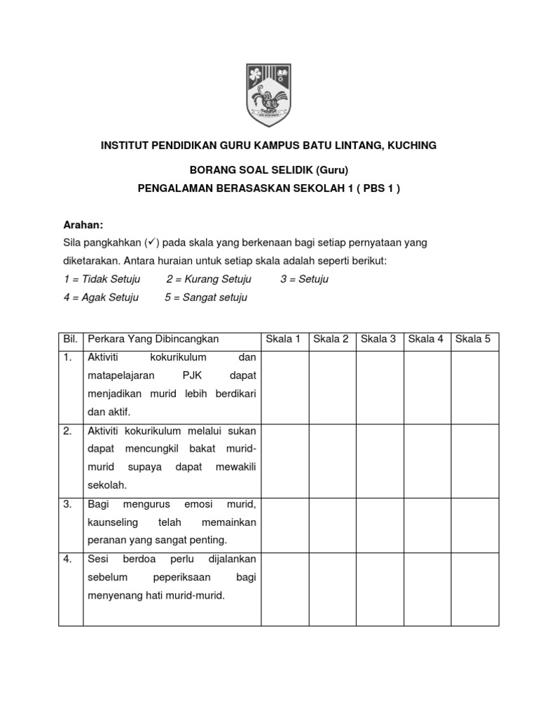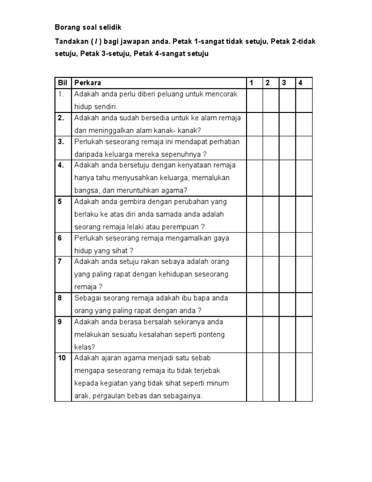 Borang kaji atau soal selidik ini perlu dibuat dalam perlaksanaan dan disertakan dalam pelaporan tugasan wajib bagi ujian pelbagai instrumen (geografi) pentaksiran tingkatan 3 (pt3) kajian lapangan atau lebih dikenali sebagai kerja kursus, agar menjelaskan lagi hasil dapatan dan maklumat yang. Pilih satu jawapan dengan menandakan ( / ) dalam. Please fill this form, we will try to respond as soon as possible. Borang soal selidik kajian merokok dikalangan pelajar. Borang soal selidik gaya hidup siha. §buang air besar dan kecil kurang lancer. Staf takut untuk membuat aduan sekiranya mereka. Saya perlu pergi ke kelas tambahan. Lampiran l borang soal selidik perusahaan batik di. Download borang soal selidik, we are a sharing community. Borang soal selidik guru pbs by nishandra shan 1283 views. Borang soal selidik pengurusan ponteng sekolah dan pengaruhnya terhadap masalah ponteng dalam kalangan pelajar sekolah rendah di daerah kota belud. Soal selidik tekanan indvidu (kumpulan sokongan) dan skala likert digunakan untuk pengukuran gejala tekanan dan tekanan kerja kakitangan kumpulan sokongan.