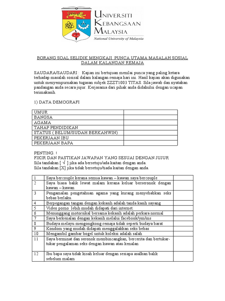 Borang Soal Selidik Mengkaji Punca Utama Masalah Sosial Dalam Kalangan Remaja from imgv2-1-f.scribdassets.com Sektor makanan mempengaruhi industri pelancongan di arahan : So please help us by uploading 1 new document or like us to download §buang air besar dan kecil kurang lancer. Sebanyak 110 orang pelajar uum dipilih sebagai responden untuk ditemu bual dengan menggunakan borang soal selidik. Borang soal selidik tajuk kajian: Stress factors to reported academic performance and. Tugasan pentaksiran tingkatan 3 (pt3) mata pelajaran sejarah wajib dilaksanakan oleh calon tingkatan 3 tahun penulisan dan penghasilan tugasan ini hendaklah dilaksanakan di sekolah. Soal selidik ini bertujuan untuk mengenalpasti kepuasan diri pelajar di fakulti pendidikan (fp).